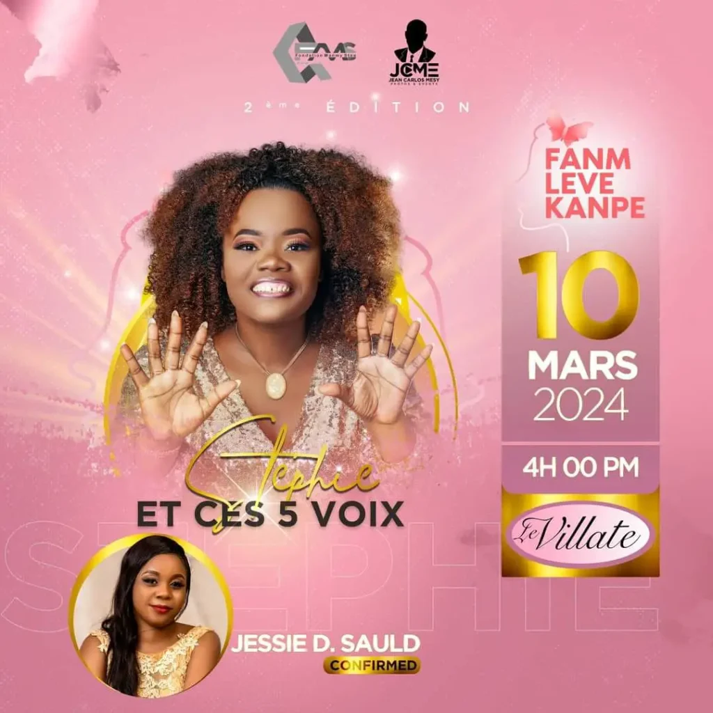 The enthusiastic announcement from singer Stephie Pierre confirmed the presence of five exceptional artists for the second edition of her major show, “Stephie et ces 5 Voix”, scheduled for the 10th. next March. Under the captivating theme “ Fanm Leve Kanpe“, this event promises an unforgettable evening featuring exceptional vocal talents such as: Jessie Desir Sauld, Leila Chery, Auralie Antoine” href=”https://www.bgospel.com/tag/auralie-antoine/” rel=”tag”>Auralie AntoineVava Sylvain, Myrline Louis.