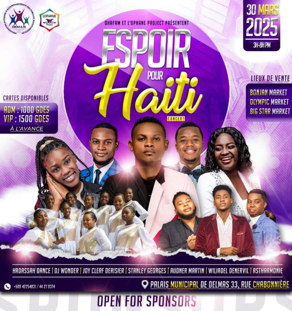 A evangelical concert solidarity for single –parent families in Haiti Will be held on March 30, 2025 at the Municipal Palace of Delmas. Organized jointly by Ohafam and Ophane Project, this event aims to provide support for Haitian uniparental homes, which represent around 60% of the country in the country9.